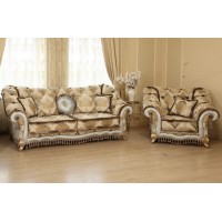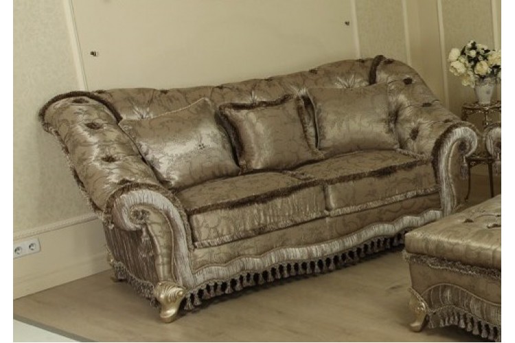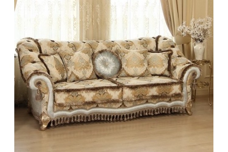 Диван Армандо від Белліні виглядає святково та елегантно. Округлі м'які підлокітники та нижня частина каркасу прикрашені великими декоративними пензликами. В оформленні дивана також є бахрома і ромбоподібна стяжка. Оббивка з жаккарда приємна на дотик, стійка до передчасного зносу і привертає увагу завдяки чудовим складним візерункам. Опори виконані у формі вигнутих ніжок кабріолів.
