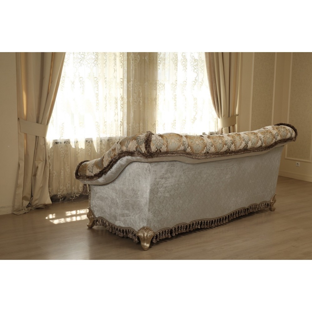Каркас дивана виготовлений з натурального каучукового дерева твердої породи гевею, міцний, надійний та довговічний в експлуатації. Для заповнення м'яких елементів використаний пінополіуретан. Диван доповнений декоративними подушками з обробкою бахромою.