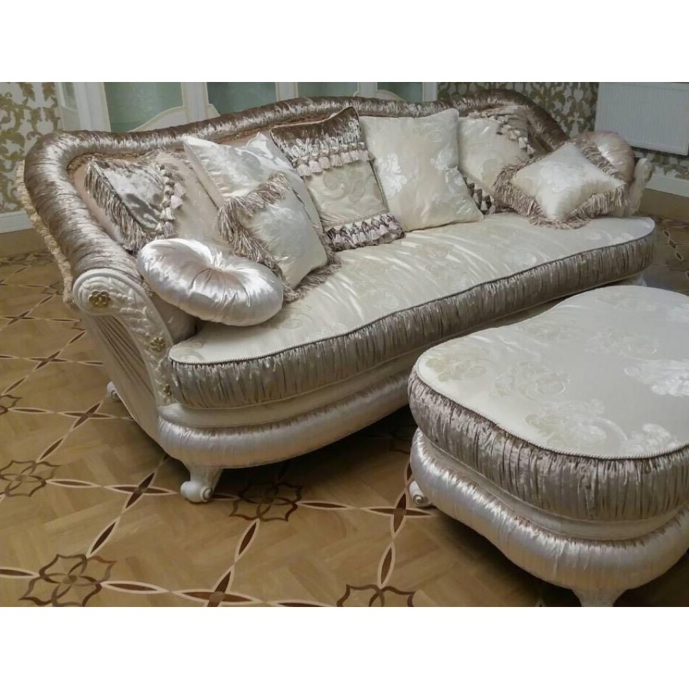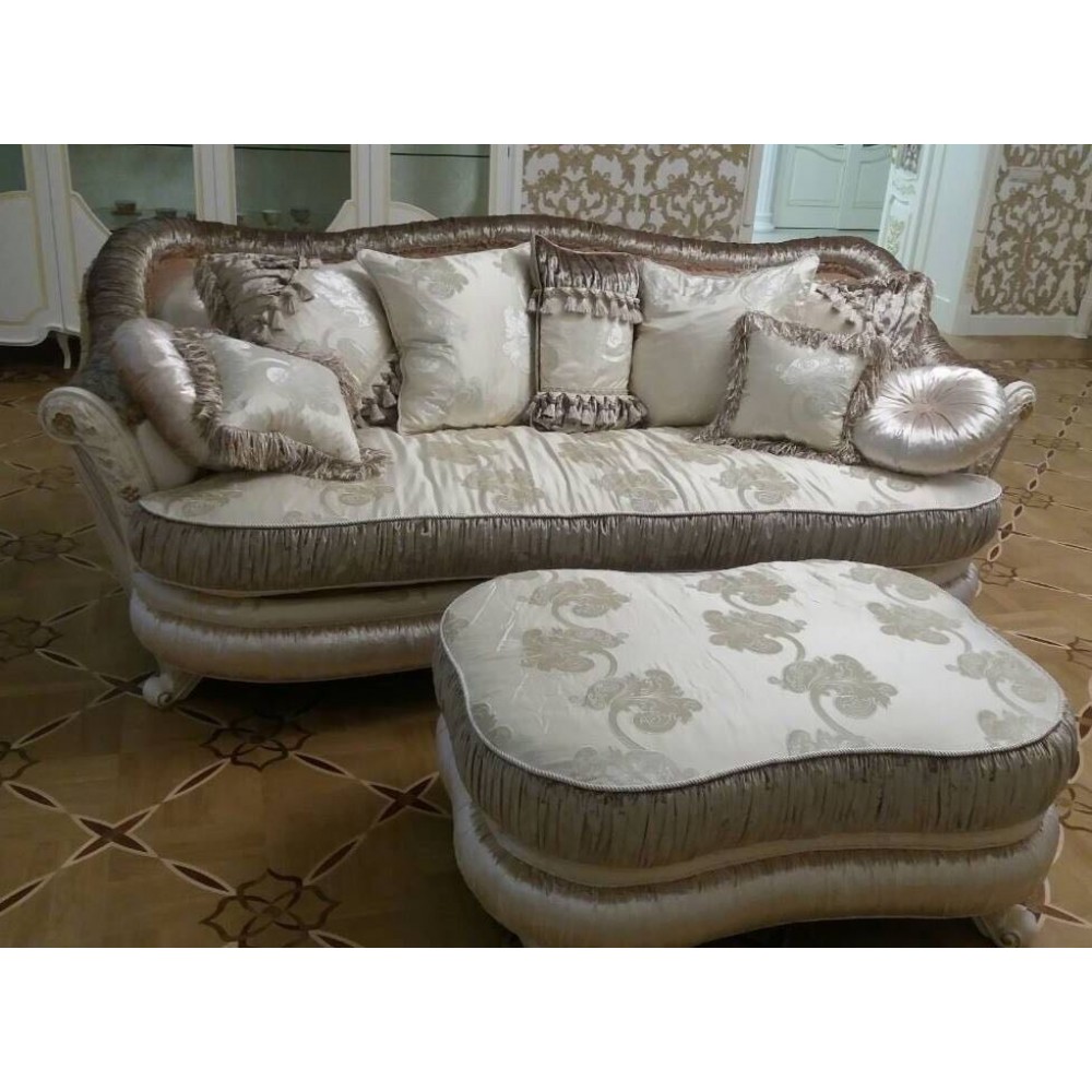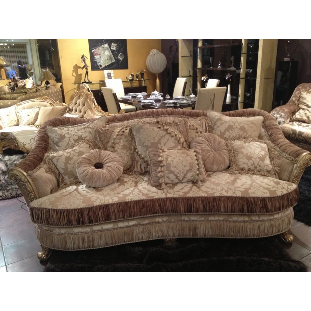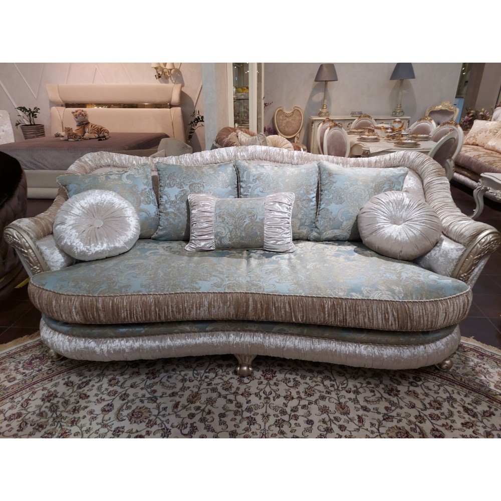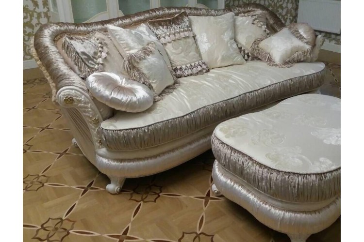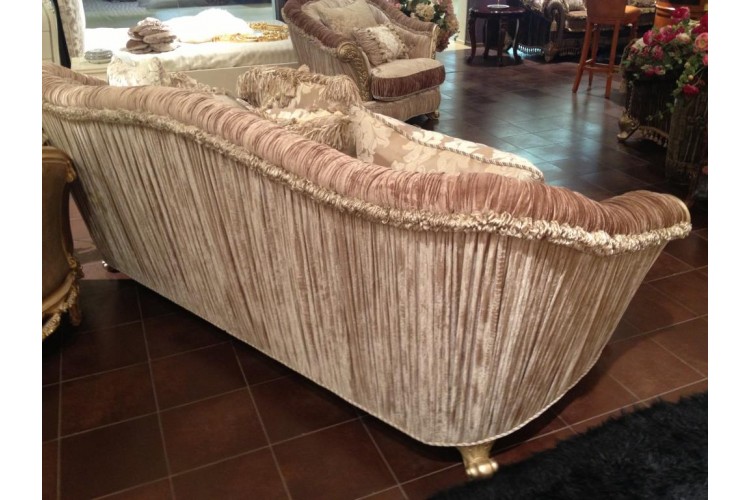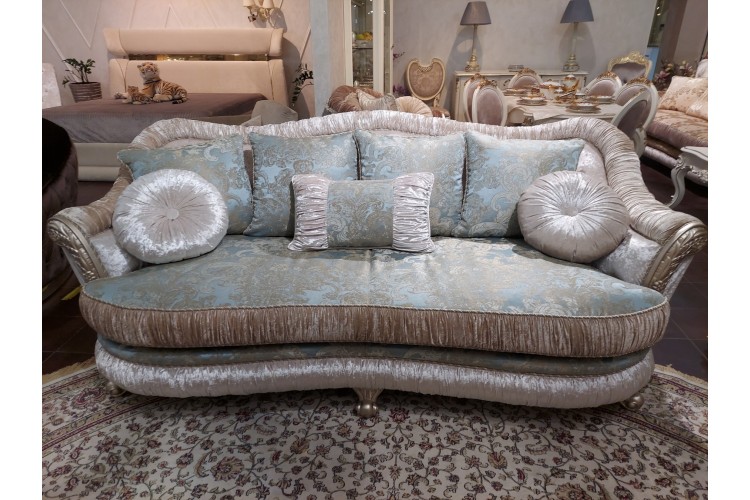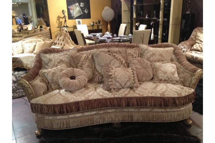 Тримісний розкладний диван "Леонардо" від Белліні втілює вишуканий стиль та високий рівень комфорту. Вигнута спинка, що плавно переходить у підлокітники створює особливо елегантний силует. Опори представлені у вигляді витончених ніжок кабріолів. Для оббивки використано кілька тканин, одна з яких – жаккард із чудовим тканинним малюнком. На підлокітниках та опорах присутні різьблені візерунки, покриті позолотою. Диван доповнений декоративними подушками різних форм і розмірів, з обробкою бахромою та пензликами.