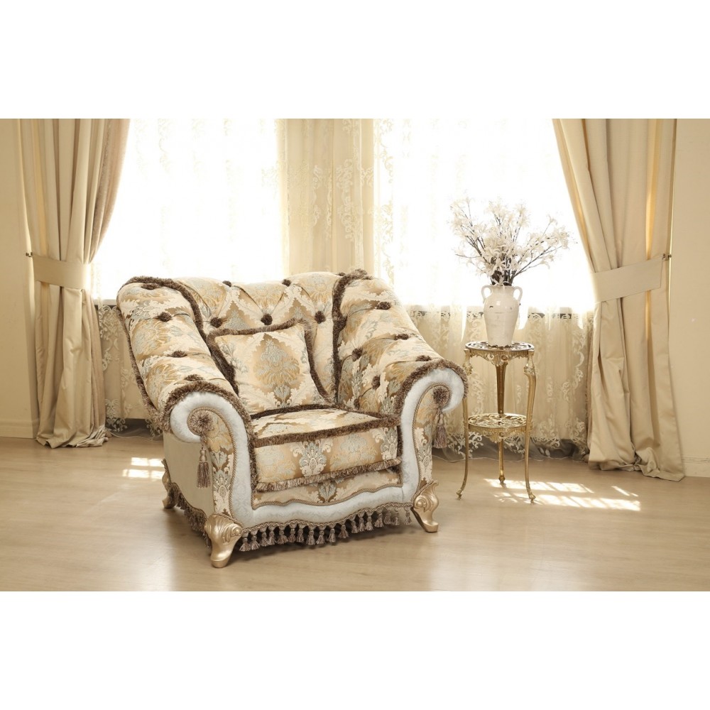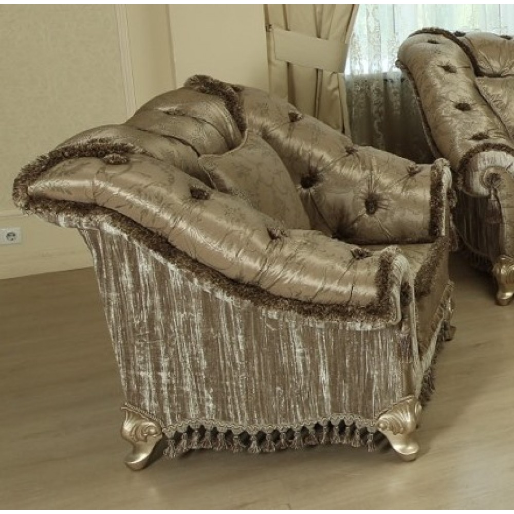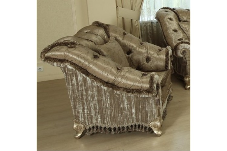 Завдяки плавним лініям та округлим формам, крісло «Армандо» від Bellini виглядає особливо елегантно. Внутрішня сторона спинки оформлена в популярній техніці капітоні з використанням великих декоративних гудзиків. М'які округлі підлокітники оздоблені великими пензликами. Стрічка декоративних пензликів є також на нижній частині каркаса. Оббивка виконана з елітної жакардової тканини з чудовими тканинними візерунками та вставками з бахроми. Опори представлені у вигляді вигнутих ніжок кабріоль, покритих сріблом.