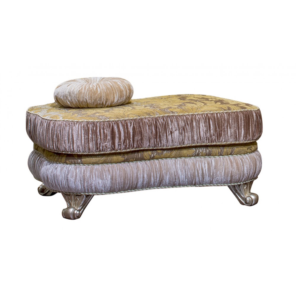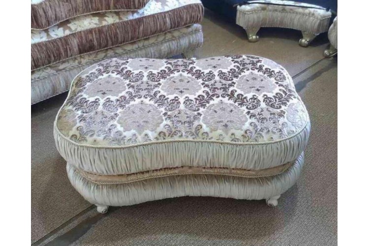 Конструкція пуфу виготовлена з натурального каучукового дерева гевея, міцна, надійна та безпечна в експлуатації. Завдяки високоякісному наповнювачу, пуф має оптимальний рівень м'якості та досить пружність. Опори представлені у вигляді витончених ніжок кабріоль і надають силуету меблів витонченості. Оббивка виконана з кількох видів елітної тканини – жаккарда та однотонного комбінованого велюру. Жаккард вражає складними тканинами, а велюр надзвичайно ніжний і приємний на дотик.