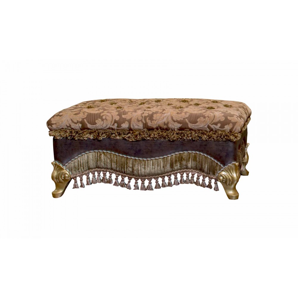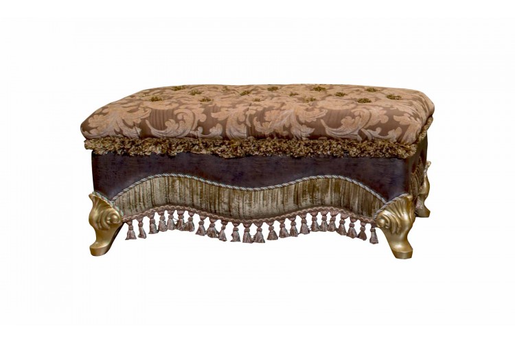 Пуф відрізняється зручністю, високою якістю та довговічністю. Конструкція досить міцна, виготовлена з натурального каучукового дерева твердої породи гевею. Опори є витончені ніжки кабріоль, покриті позолотою. Завдяки цьому пуф виглядає ще розкішніше. Оббивка приємна на дотик, виконана з жаккарда з чудовими тканими візерунками та однотонного комбінованого велюру.